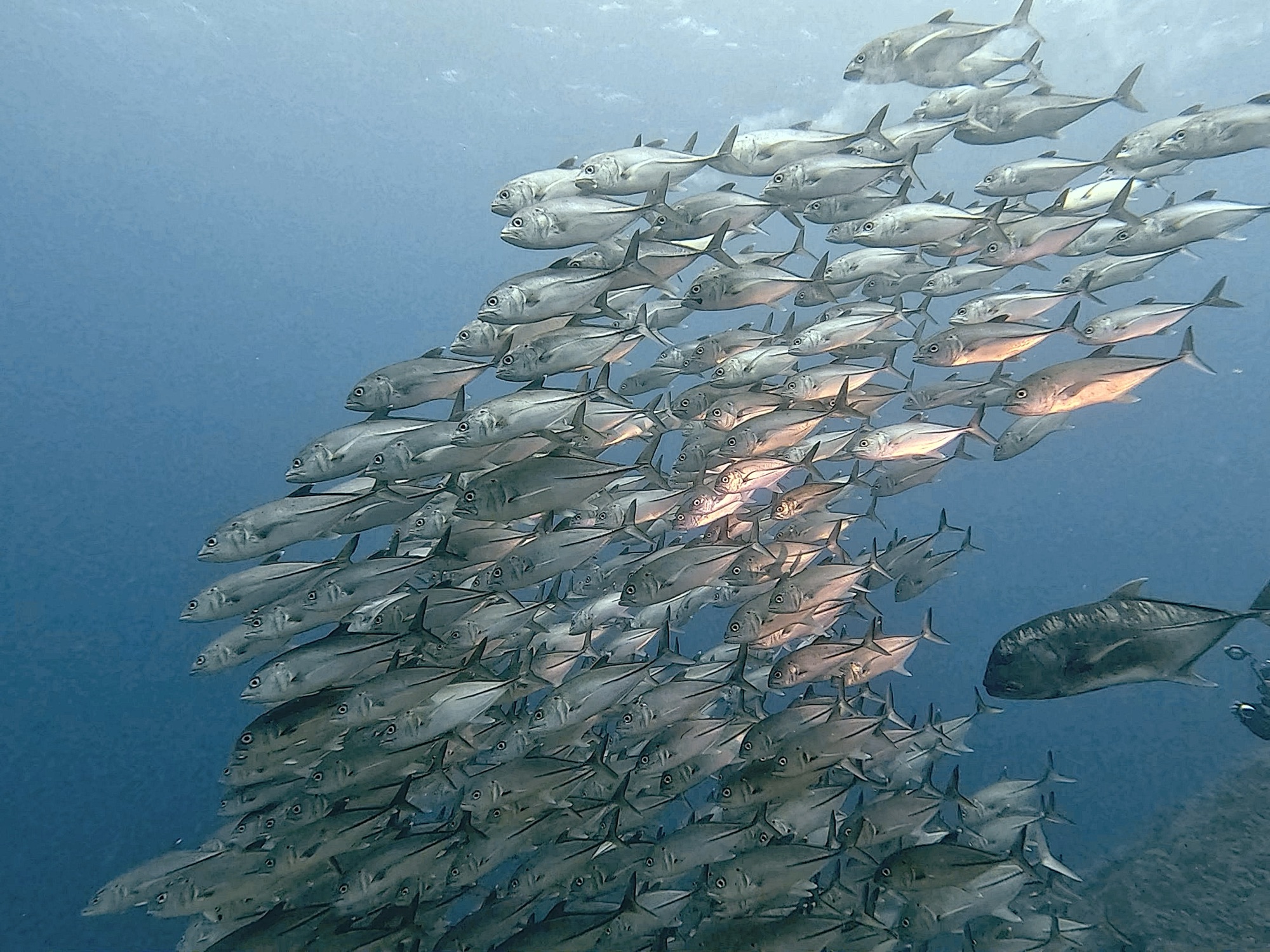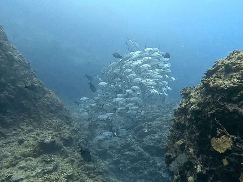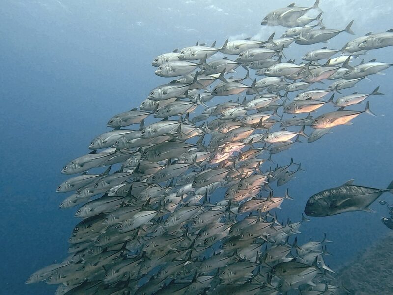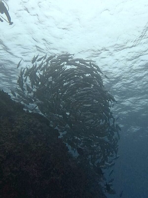 今期2回目の粟国遠征でした。今日の1本目は、水中もどんよりしている中、ギンガメは溌剌としてましたね。超特急一瞬にして目の前を通り過ぎて行きました。速すぎて思わず笑ってしまいました。そして安全停止前に1匹のハンマーヘッドシャークがいました。2本目は沖を流してギャンブルダイビング。ハンマー3匹とツムブリグルクンの群の下にハンマー1匹の計4匹見れましたー!3本目は小玉のギンガメアジでしたね。小さいトルネードもみれました