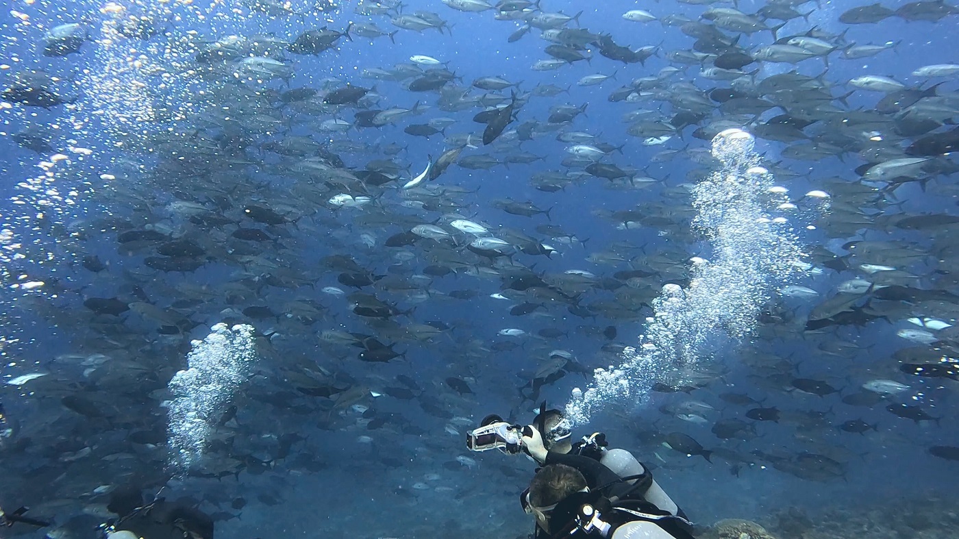 本日もしっかりギンガメアジの群れを見ることができました。他にはグレーリーフシャークも浅場に登場して肉眼ではしっかり見れました。透視度も良くて楽しめた一日でした。