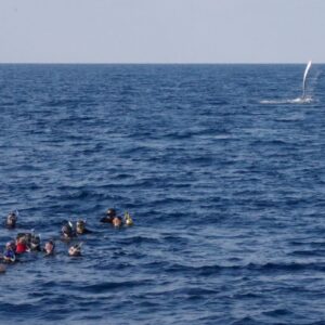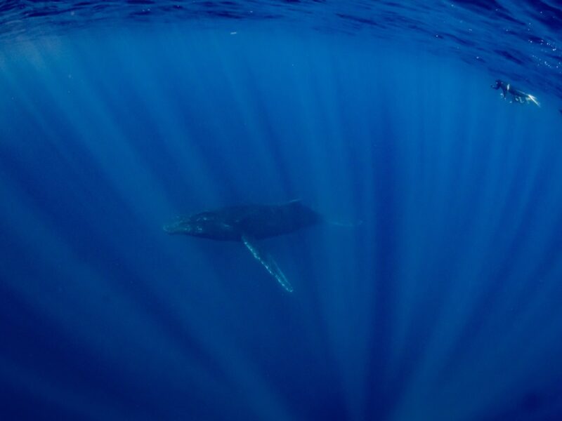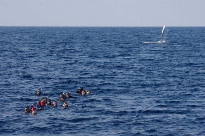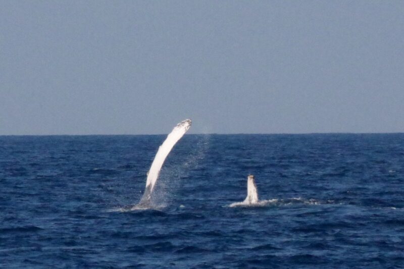 ホエールスイム23日目 2026.02.15 2026.2.15(日) 今日は3群3頭発見、2頭とスイムしました。 1頭目はシンガーでした。いつもシンガーを見つけても、なかなか姿を見せてくれず歌のみの披露でしたが、今日のシンガーは歌いながら水中で姿を見せてくれました。2頭目は船の近くで急に上がってきたシングル。ブリーチングやペックスラップも披露してくれました。今日のシンガーはいっぱい楽しませてくれましたね♪ ひな R-953 2009年から4回確認