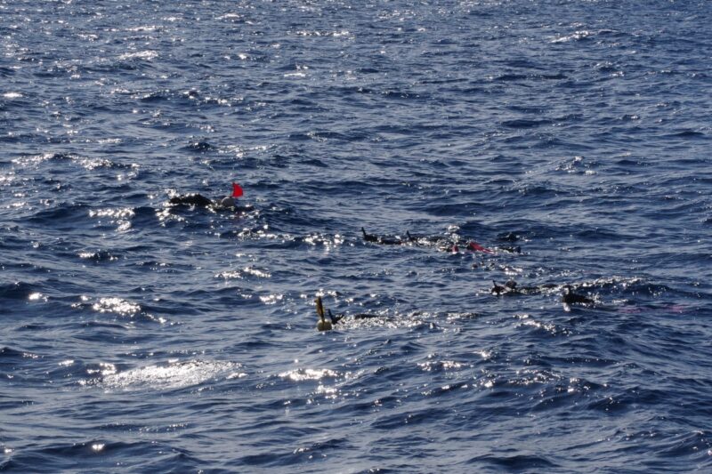 今日は朝から捜索難航…ドキドキハラハラしながらなんとか1頭発見するも再確認できず。次の捜索に移ろうとした時、まさかの船の近くの浅いところにいてくれて一緒に泳ぐことができました!!その後、ブリーチング、ヘッドスラップ、ペックスラップなどたくさんのパフォーマンスを見せてくれました。このクジラは沖縄美ら島財団の調査によると2006年からみられているみたいでR-640という個体だそうです。