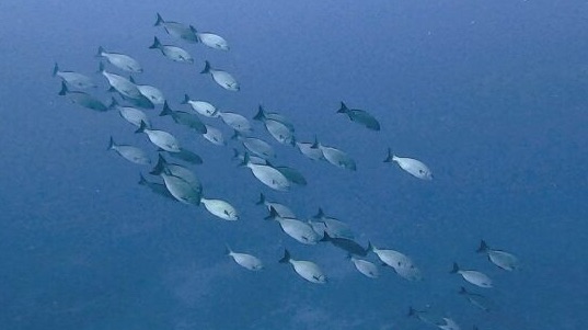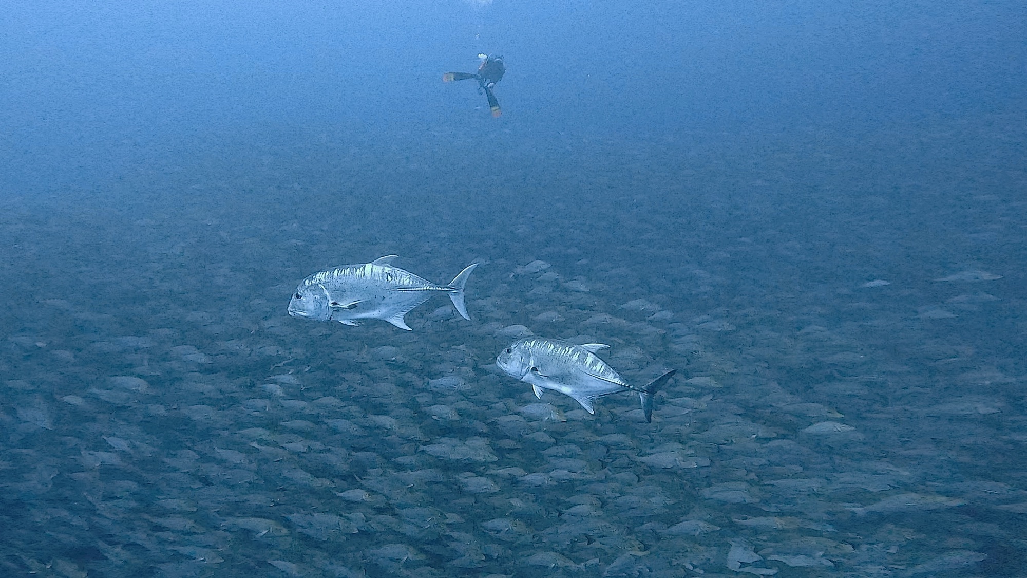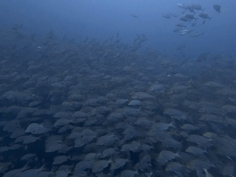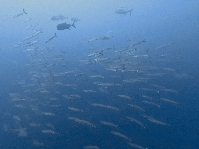 今日のトライアングルは流れも速くかなり濁ってました。1本目、いつもあんなにいるタマンは…?とノータマンでした。でも、救世主のバラクーダが横を高速で通ってくれましたね。2本目、3本目と透明度も少し回復してくれ、タマン山を見ることができました。もう少し透明度が良くなってくれたらなぁ…今日のゲストさんはロウニンアジが大好きみたいで、トライアングルのロウニンアジは大きくて大興奮されてました〜タマンとロウニンアジのコラボが見れて良かったですね♪