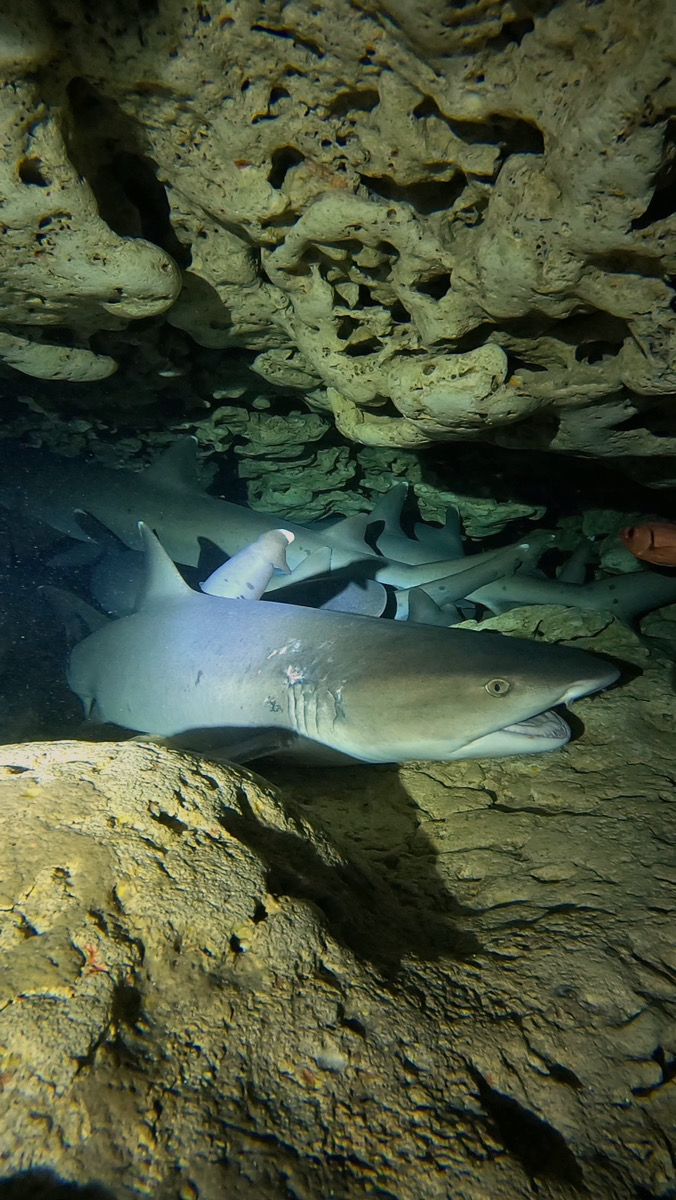 三本目は久しぶりにルカン礁で潜りました。海底温泉では鮫がどっさり集まっていました。